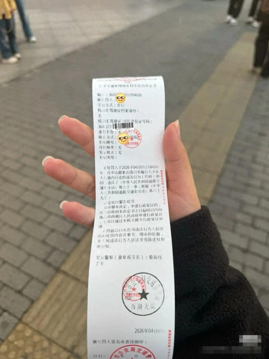 4月2日,该网友向经视直播记者介绍,4月1日18时许,自己在南昌市中山路象山路口行走时,因未在人行道内行走,而是走在了非机动车道上,被南昌市公安局交通管理局西湖大队民警当场查处,并开具了行政处罚决定书。处罚决定书显示,当事人实施行人不在人行道内行走的违法行为,违反《中华人民共和国道路交通安全法》第六十一条,依据第八十九条规定,给予警告处罚。该网友表示,经过此次提醒,今后会自觉遵守交通规则,避免再次违法被罚。