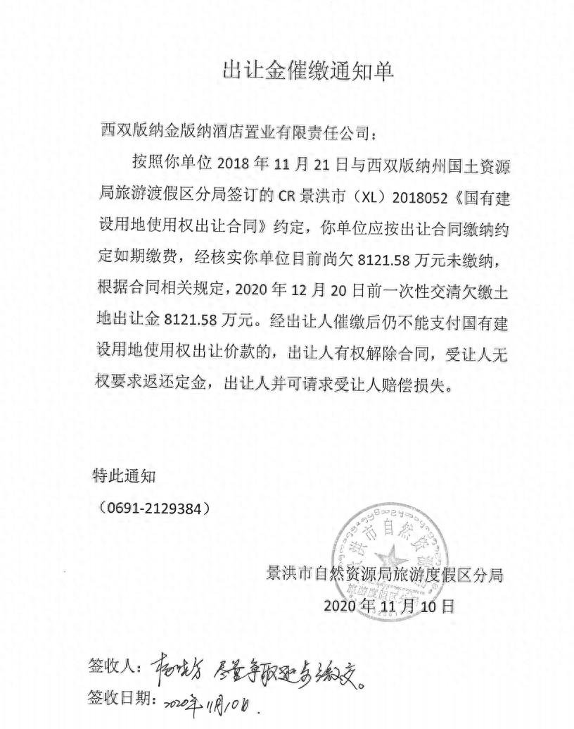 在案证据显示,自2019年7月1日起,当地官方多次发文至金版纳公司催缴土地出让金。早在2019年11月12日,西双版纳旅游度假区管委会便在催缴文件中明确,若该公司不按期缴纳,将按每日3‰征收滞纳金,并暂停办理其在度假区内项目相关手续。此后,景洪市自然资源局旅游度假区分局亦于2020年两次发文催缴,金版纳公司签收时仅表示将争取逐步缴纳。
