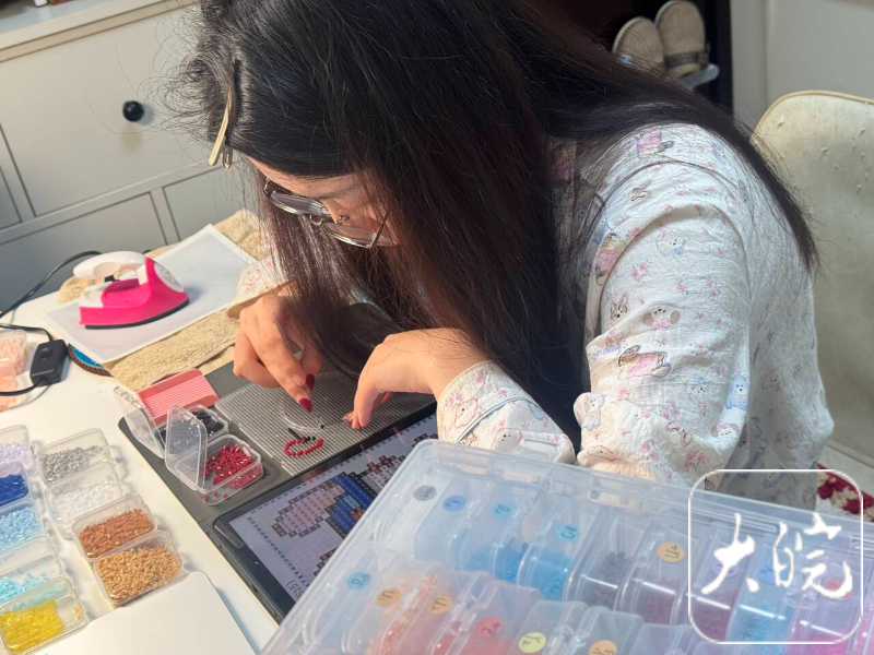大皖新闻讯 色彩斑斓的塑料小珠子,在指尖镊子的操控下排列组合,经熨斗轻轻加热定型,便摇身一变成为像素风钥匙扣、可爱冰箱贴或灵动摇摆玩偶……这种被称为“拼豆”的手工活动,正悄然席卷年轻群体,成为职场人和学生缓解焦虑、释放压力的新选择。在小红书、抖音等社交平台,“我染上了拼豆”等相关话题浏览量已突破70亿次,讨论量超1700万。