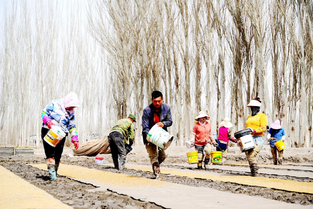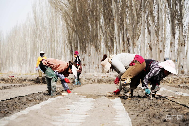在温宿县托乎拉乡托万克库尔巴格村的育苗基地里,农户抢抓农时开展集中育秧工作 (央广网发 赵新昌 摄)