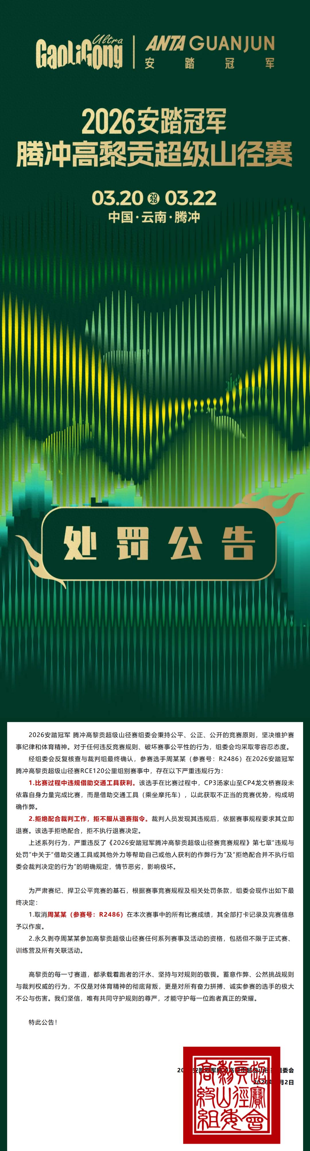 经组委会反复核查与裁判组最终确认,参赛选手周某某(参赛号:R2486)在2026安踏冠军腾冲高黎贡超级山径赛RCE120公里组别赛事中,存在以下严重违规行为: