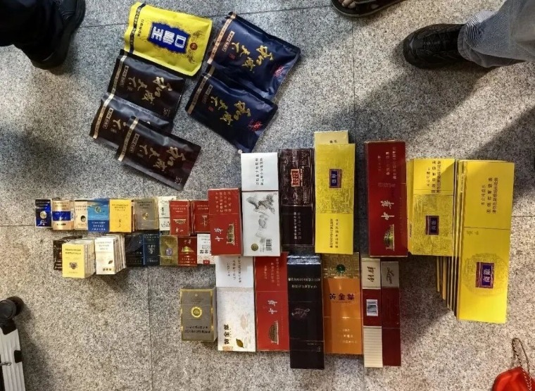 嫌疑人(中间打马赛克者)指认被盗的涉案香烟