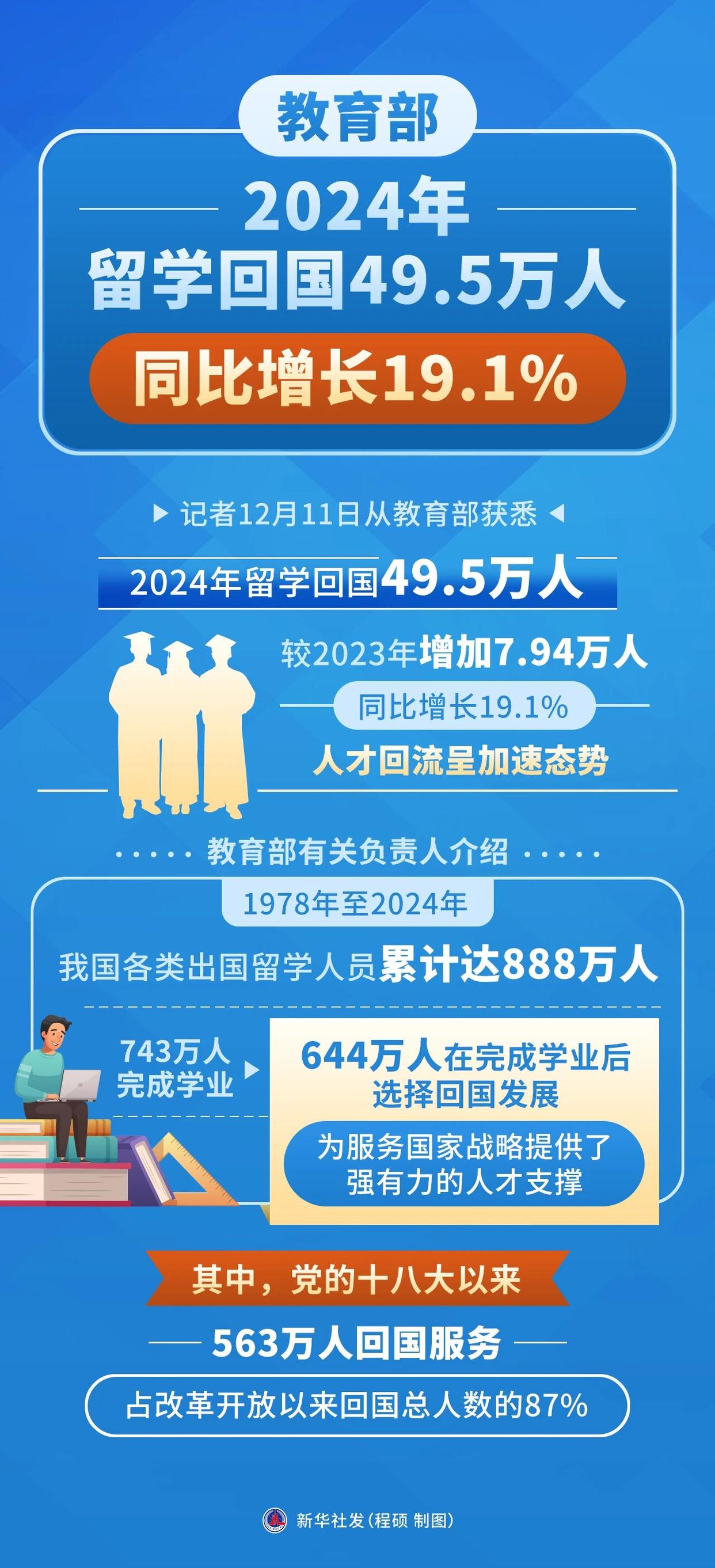 教育部统计数据显示,从1978年到2024年,我国各类出国留学人员累计达888万人,其中644万人在完成学业后选择回国发展,为服务国家战略提供了重要人才支撑。