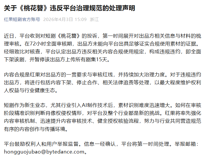 近日,平台收到对短剧《桃花簪》的投诉,第一时间展开对出品方相关信息与材料的梳理审核。在72小时全面审核期,出品方未能向平台出具足够证实合规使用素材的证据。经细致比对核查,平台认定出品方违反相关内容合规使用规定,构成违规违约,即全面下架该剧,并暂停该出品方上传所有剧集15天。