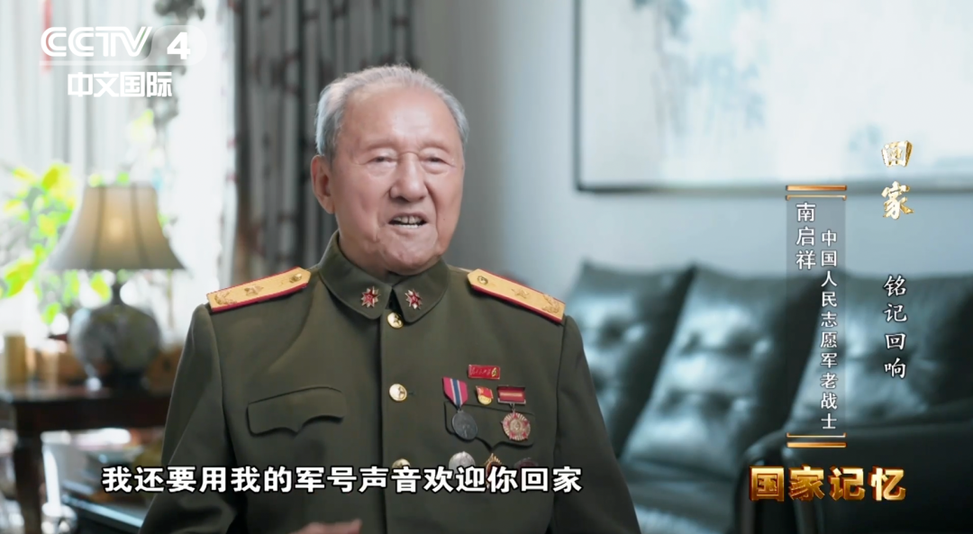 吹号的人,是90岁的志愿军老战士南启祥。当年这号声唤过冲锋、也叫过撤退,如今,它是呼唤,呼唤着志愿军将士的心愿——“回家”。