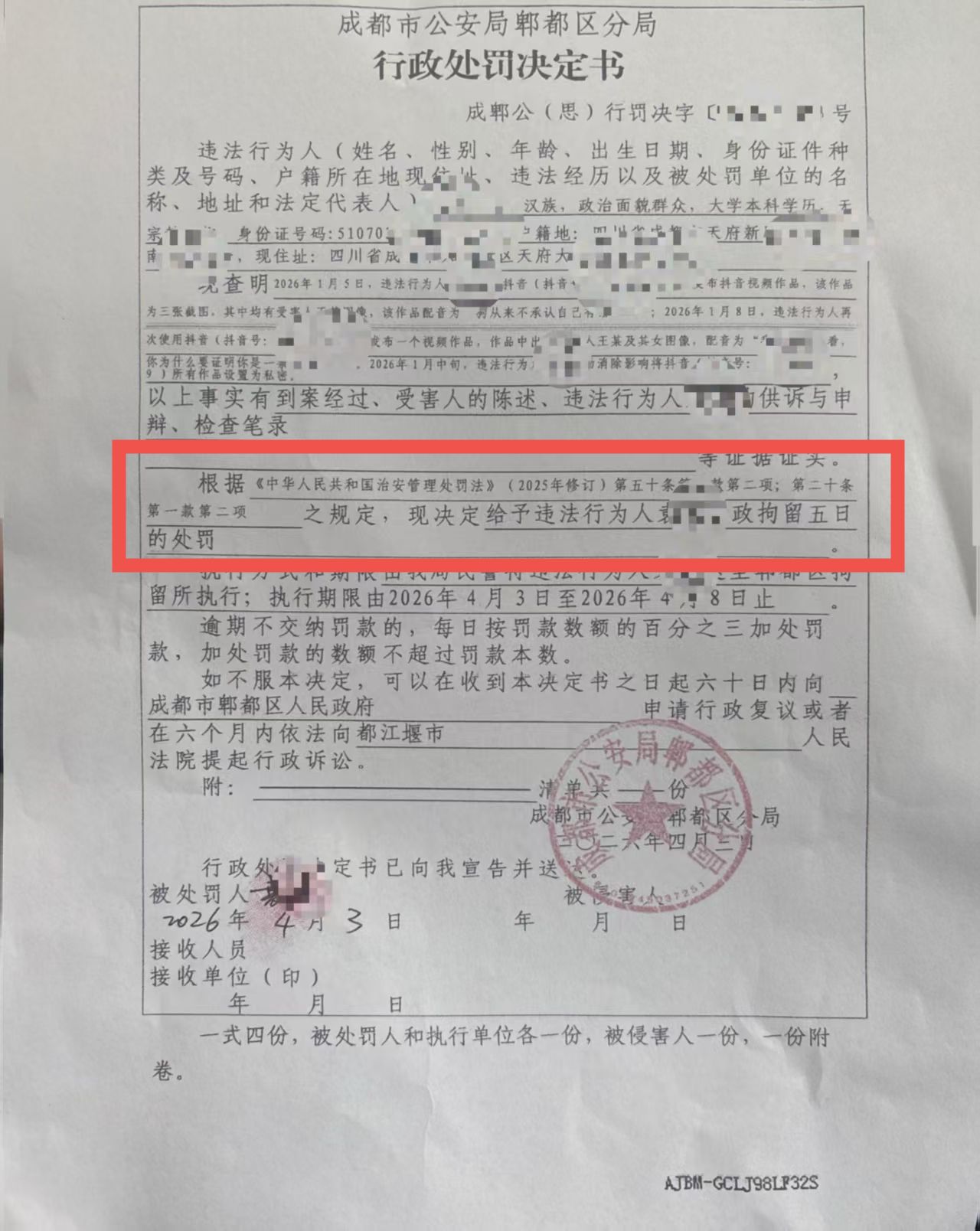 成都市公安局郫都区分局行政处罚决定书显示,袁某,男,1991年出生,本科学历。袁某两次使用抖音号发布视频作品,里面均有受害人王女士及其女儿图像,并配音辱骂她们为“狗”。决定给予违法行为人袁某行政拘留五日的处罚。
