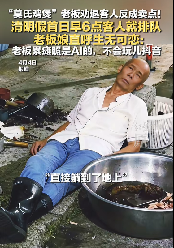 莫氏鸡煲老板娘发声辟谣:“老板累瘫照”是AI生成的,吐槽“鸡难吃”的账号也不是老板小号,老板不会玩抖音