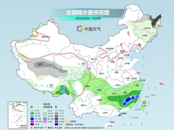 4月6日,内蒙古东北部、东北地区中北部、西藏东北部和西北部、青海南部等地部分地区有小雪或雨夹雪,其中,黑龙江东北部、青海南部等地部分地区有中到大雪,黑龙江东北部等地局地暴雪。西藏东南部、江南中南部和广东东北部等地部分地区有中到大雨,其中,江西南部、福建西部和北部等地部分地区有暴雨。