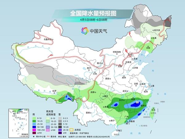 中央气象台预计,4月5日,内蒙古东部、东北地区中北部、西藏西部和北部、青海南部、川西高原北部等地部分地区有小雪或雨夹雪,其中,内蒙古东北部、黑龙江中北部、川西高原北部等地部分地区有中到大雪。西藏东南部、江南中南部、广东中东部等地部分地区有中到大雨,其中,西藏东南部、湖南西部、江西中南部、福建西部和东南部沿海等地部分地区有暴雨。