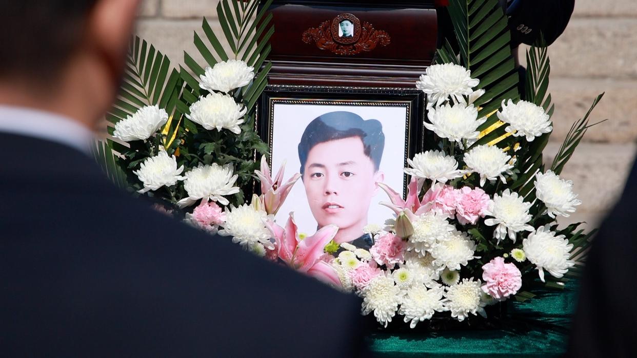 仪式现场,苏艺林烈士遗照被鲜花簇拥。新华社记者 李帅 摄