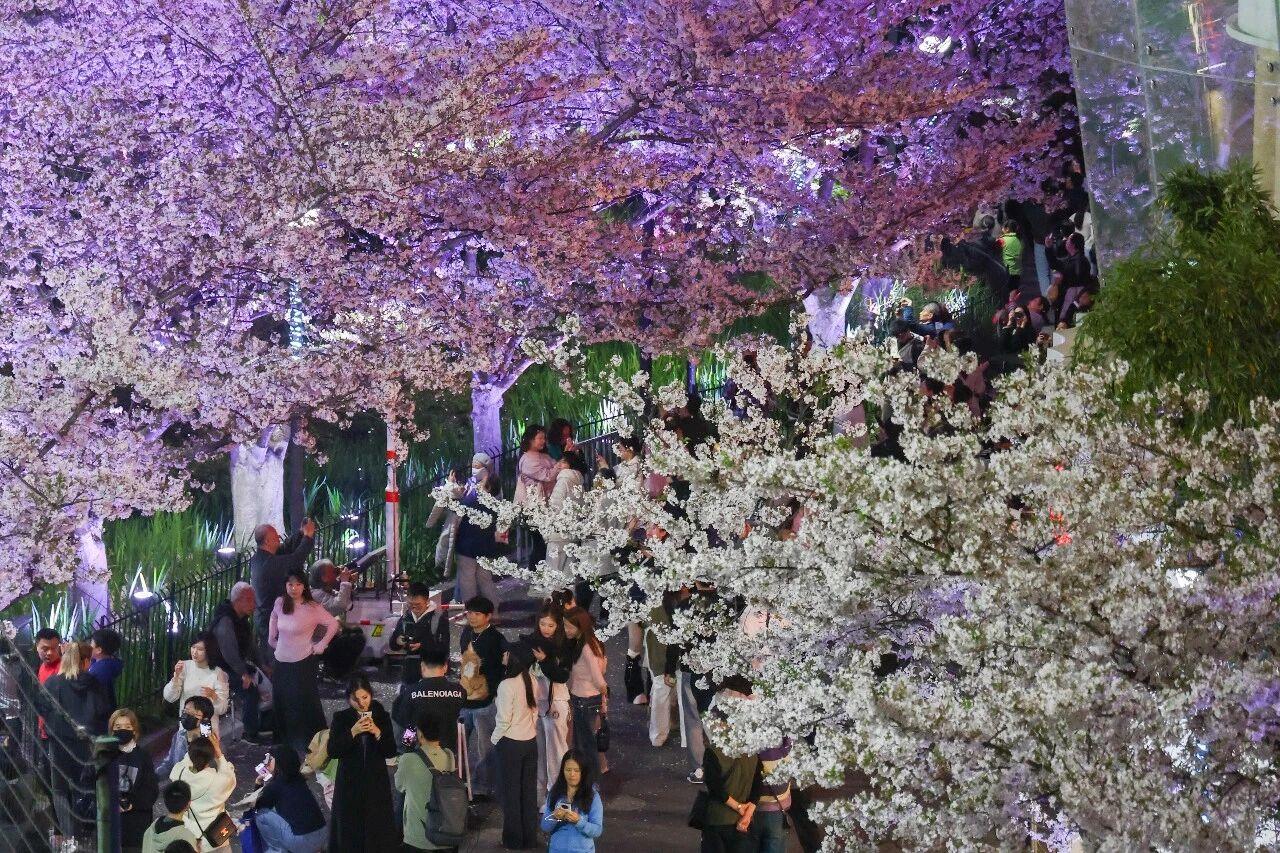 在山东淄博,数十万株早樱、晚樱、芝樱等次第开放,游客在湖光山色与花香咖韵中,打卡咖啡市集、户外音乐节,畅享春日游玩新体验。在上海,如梦似幻的灯光艺术与樱花林巧妙结合,营造出梦幻的夜间赏樱场景,吸引了八方游客慕名前往。