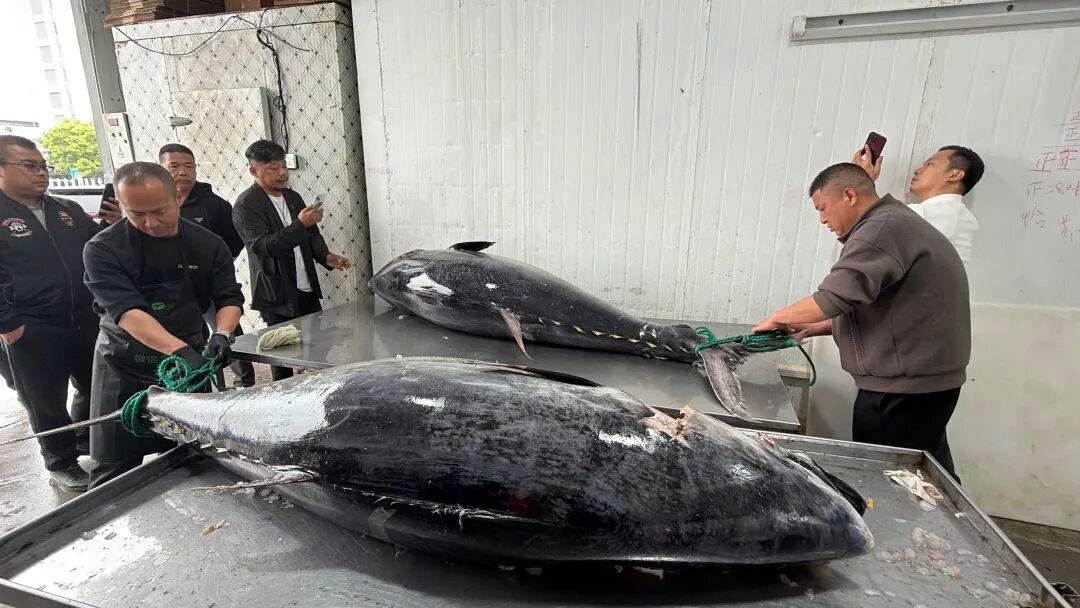 4月3日,有着30多年海洋捕捞经验的宁波奉化渔民范吉通,在东海渔区成功捕获两条重200千克以上的野生蓝鳍金枪鱼。4月6日下午,两条大鱼运抵台州温岭,交由当地企业代售,业内预估总市值超10万元。
