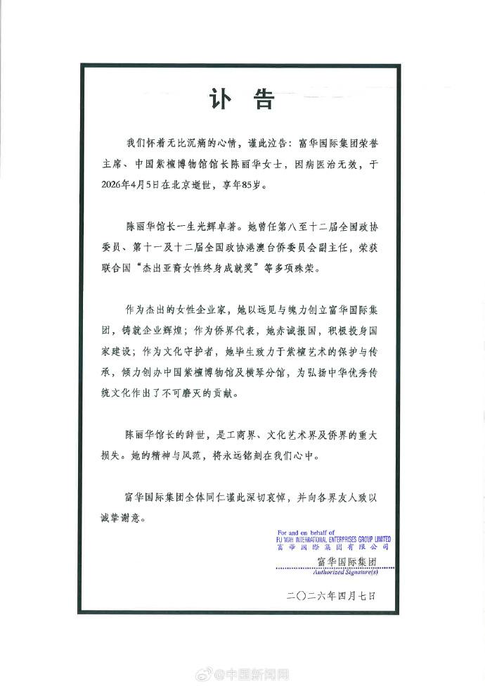据中国新闻网消息,4月7日,富华国际集团发布讣告:富华国际集团荣誉主席、中国紫檀博物馆馆长陈丽华女士,因病医治无效,于2026年4月5日在北京逝世,享年85岁。