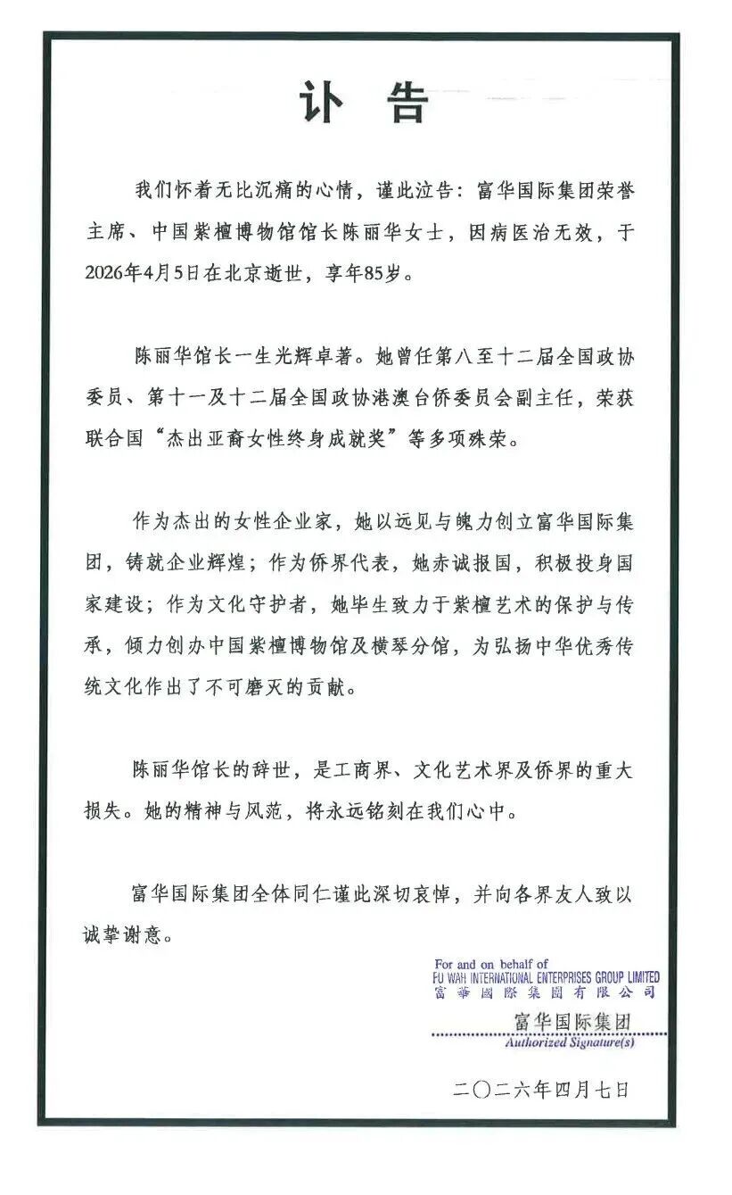 据澎湃新闻消息,4月7日,富华国际集团发讣告:我们怀着无比沉痛的心情,谨此泣告:富华国际集团荣誉主席、中国紫檀博物馆馆长陈丽华女士,因病医治无效,于2026年4月5日在北京逝世,享年85岁。