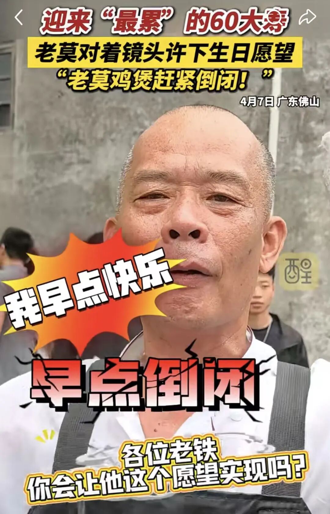 莫式鸡煲老莫迎来最“累”六十大寿!老莫对着镜头许下生日愿望,“老莫鸡煲赶紧倒闭!我早点快乐!