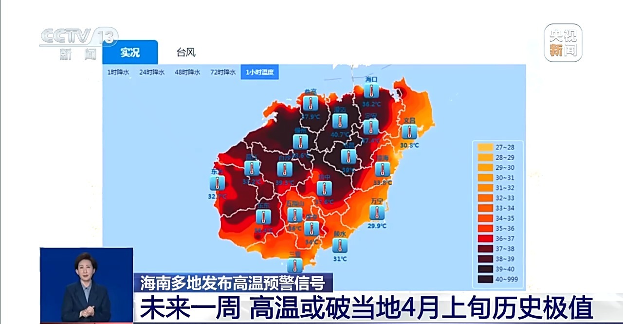 这是中央气象台今天13时—14时发布的实时气温观测图,2418个国家级气象观测站的数据显示,全国气温排名前10位里面有9个都在海南,特别是海南澄迈,今天最高气温达到了40.7℃,海南的白沙最高温度也达到了39.3℃,此外,海南屯昌、琼山、儋州、昌江等地最高温都在38℃以上。