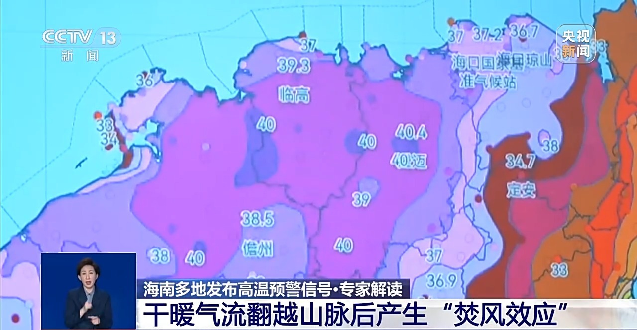 海南省气象台首席预报员 李玉梅:据最新预报显示,未来10天,海南岛还将维持这种大范围、持续性的高温天气。高温的主要原因是海南岛近期主要受西南低压槽和副热带高压的共同影响。首先,在西南低压槽控制下,海南岛受西南气流影响,该气流来自中南半岛、云贵高原等地,极度干热,经过中南半岛东部山脉和海南岛中部五指山脉,干燥的气流在背风坡下沉,发生“焚风效应”,气流在下降过程中加速升温,导致岛内西部和北部地区的气温都较高,北部地区容易出现极端高值。其次,副热带高压的控制下,海南岛以下沉气流为主,晴空少云,太阳辐射直接加热地面,导致气温较高。