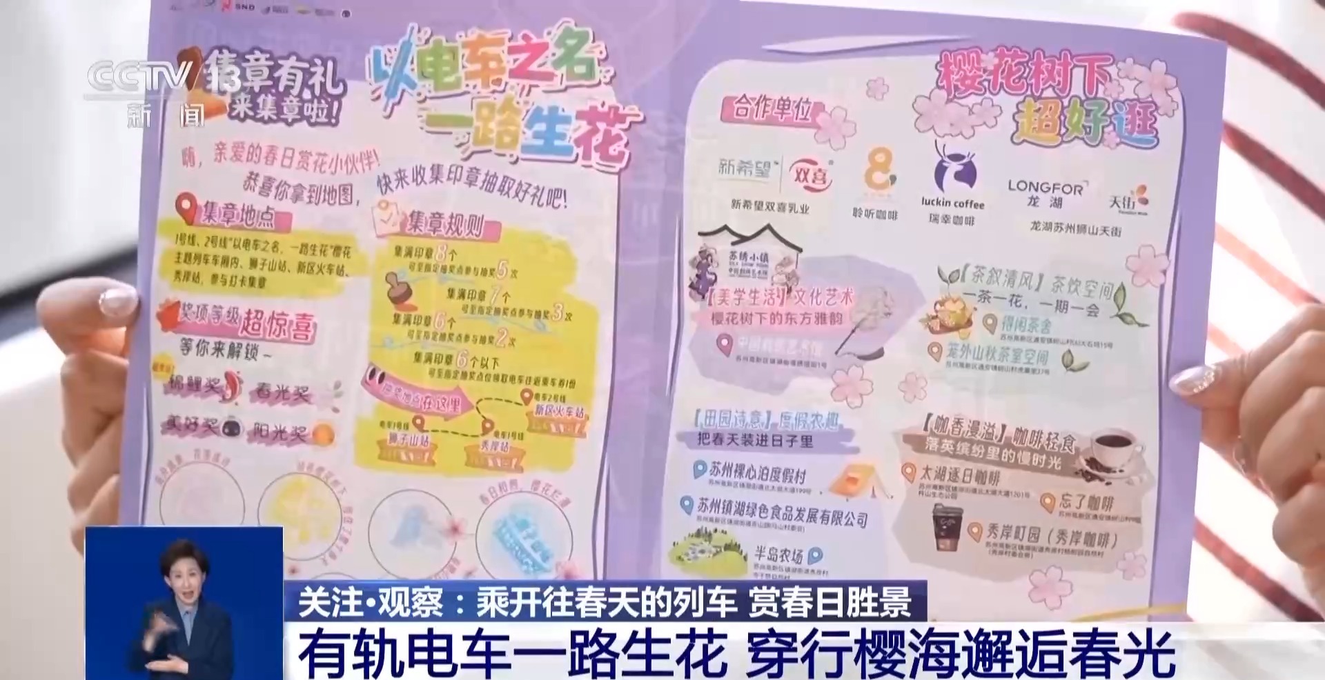 一路乘车游玩,建议在站台领取一张春日赏花地图。“沿图”前行打卡,游玩第一站,就是秀岸站看“樱花大道”,在这里不仅可以欣赏落樱如雪,还可以在樱花驿站集印章、买文创饮品,享受惬意的春日时光。