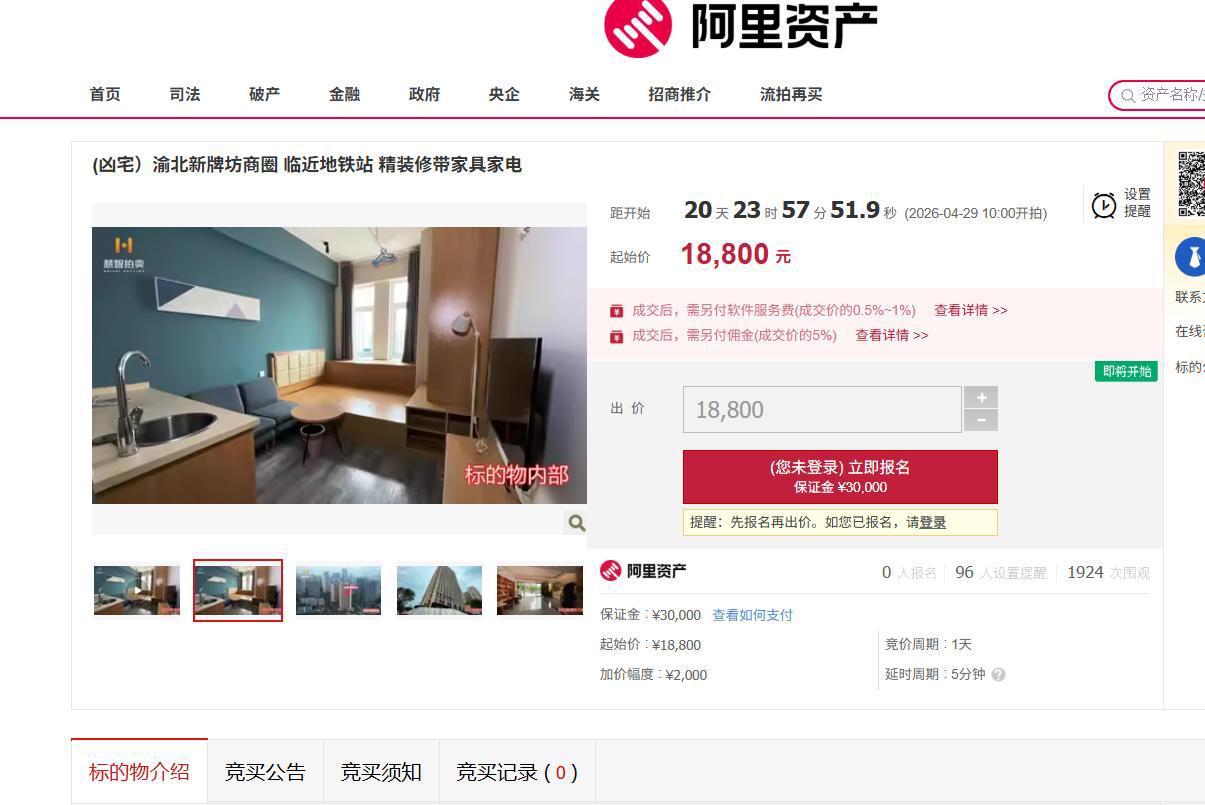 近日,阿里法拍网挂出一则凶宅的拍卖公告,位于重庆市中心的26平方米商业公寓起拍价仅1.88万元,已有96名网友设置拍卖提醒。