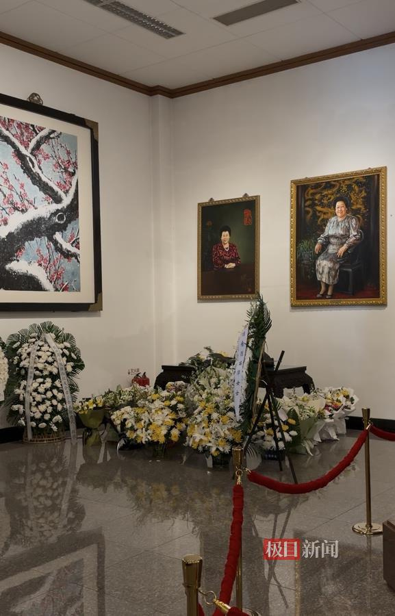 记者在现场看到,公开祭奠场所设置在博物馆一楼北厅的一角,整体空间不大。墙上挂着陈丽华的两张肖像,肖像下方摆放着一张黑色桌子,周围摆放着鲜花和各界送来的花圈。时不时有前来参观的游客在此驻足后,对着画像鞠躬悼念。