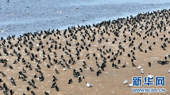 图为候鸟在甘肃民勤红崖山水库滩涂上“沐浴”阳光。新华网发(卢武林摄)