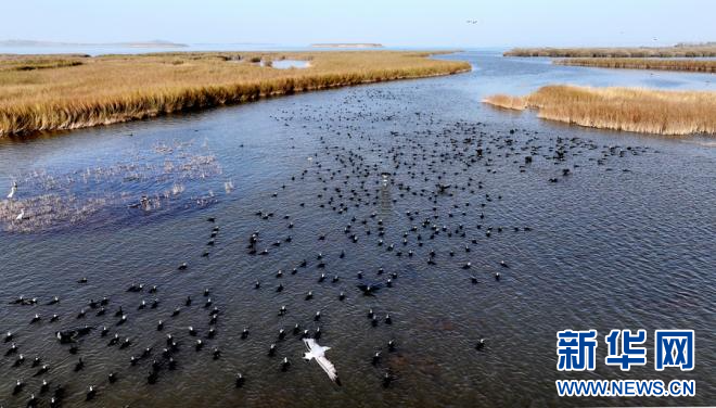 图为候鸟在甘肃民勤红崖山水库嬉戏觅食。新华网发(卢武林摄)