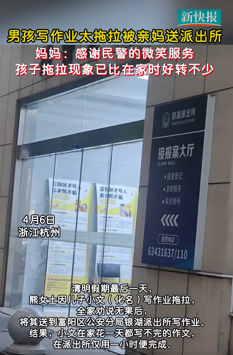 4月6日,清明小长假最后一天,杭州市民熊女士因儿子小文(化名)写作业拖拉,全家劝说无果后,将其送到富阳区公安分局银湖派出所写作业。结果,小文在家花一天都写不完的作文,在派出所仅用一小时便完成。