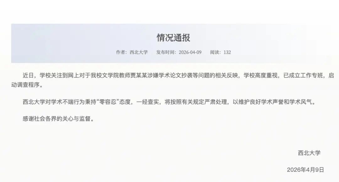 近日,学校关注到网上对于我校文学院教师贾某某涉嫌学术论文抄袭等问题的相关反映,学校高度重视,已成立工作专班,启动调查程序。