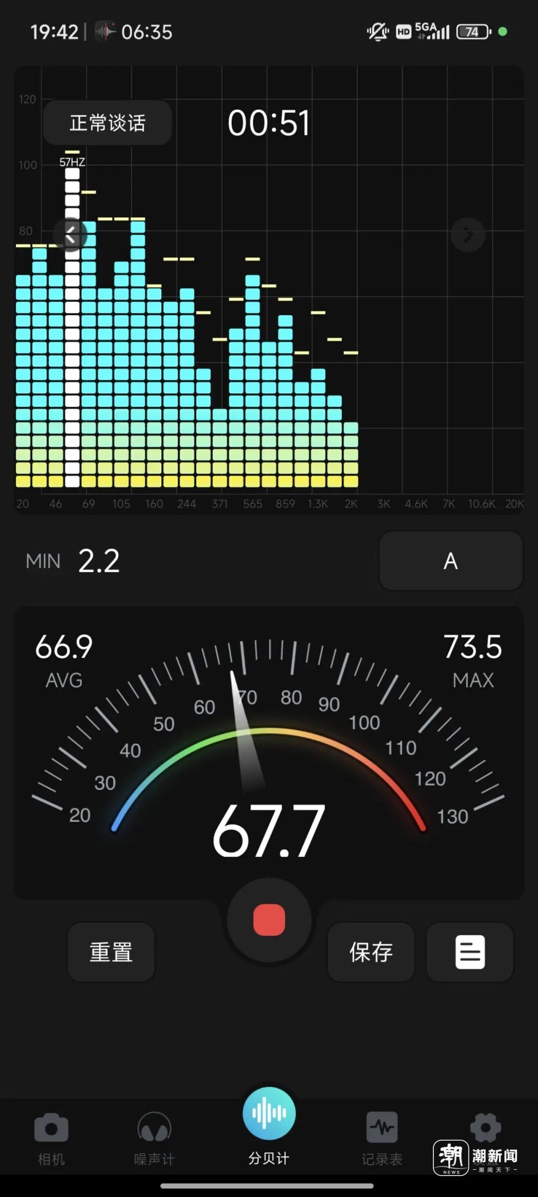 路上车流越大的时候,或者切换到节奏舒缓的曲目时,音乐声会变小,分贝值也会有所回落。