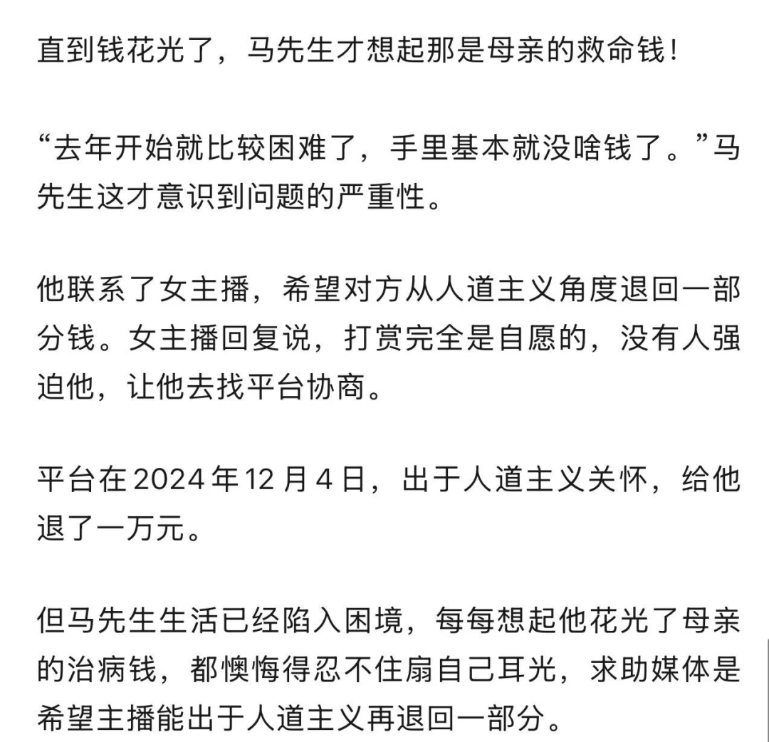 直播打赏引发的纠纷屡见不鲜。情感共鸣、虚拟荣誉、即时反馈,让不少人沉迷其中,甚至倾家荡产。你觉得马先生是否能要回自己打赏的钱呢?欢迎在评论区留言讨论。