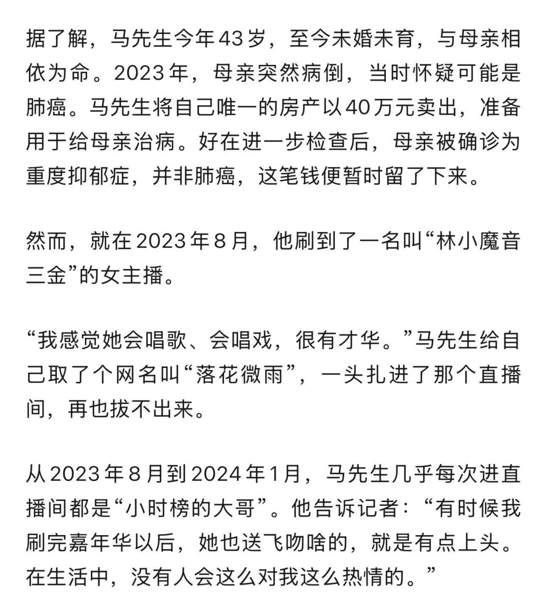 虽然并没有与女主播线下见面过,但是因为沉溺于主播和直播间观众的追捧,马先生从2023年8月到2025年8月加起来共打赏了约22.5万元。单笔最大的一笔,是一个晚上刷了18000元。
