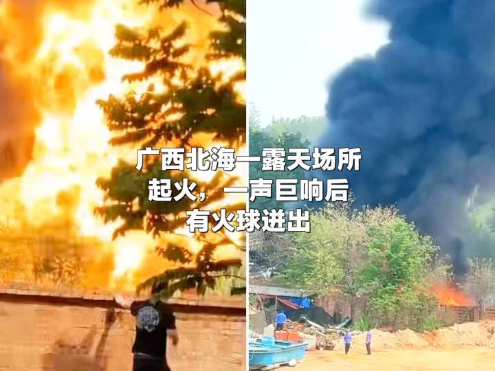 4月9日,广西北海海城区一露天场所发生火灾,当地居民拍下现场传出巨响火球升起瞬间。新京报记者从地角街道办事处获悉,起火点为一机械维修场所,火灾已扑灭,无人员伤亡,起火原因正在调查中。