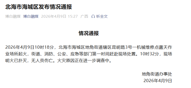 2026年4月9日10时18分,北海市海城区地角街道辖区昆明路3号一机械维修点露天作业场所起火,街道、消防、公安、应急等部门第一时间赶赴现场处置。10时32分,现场明火已扑灭,无人员伤亡。火灾原因正在进一步调查中。