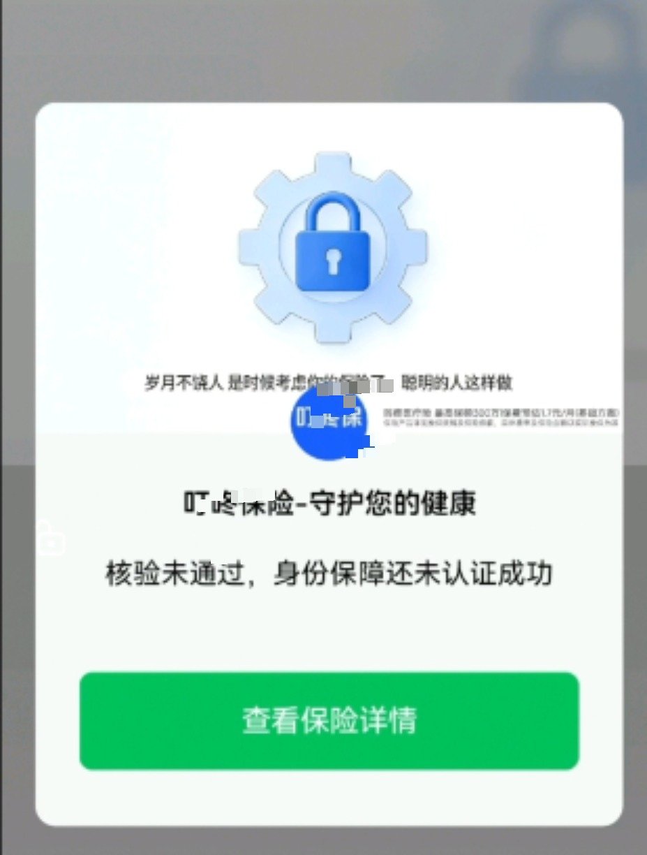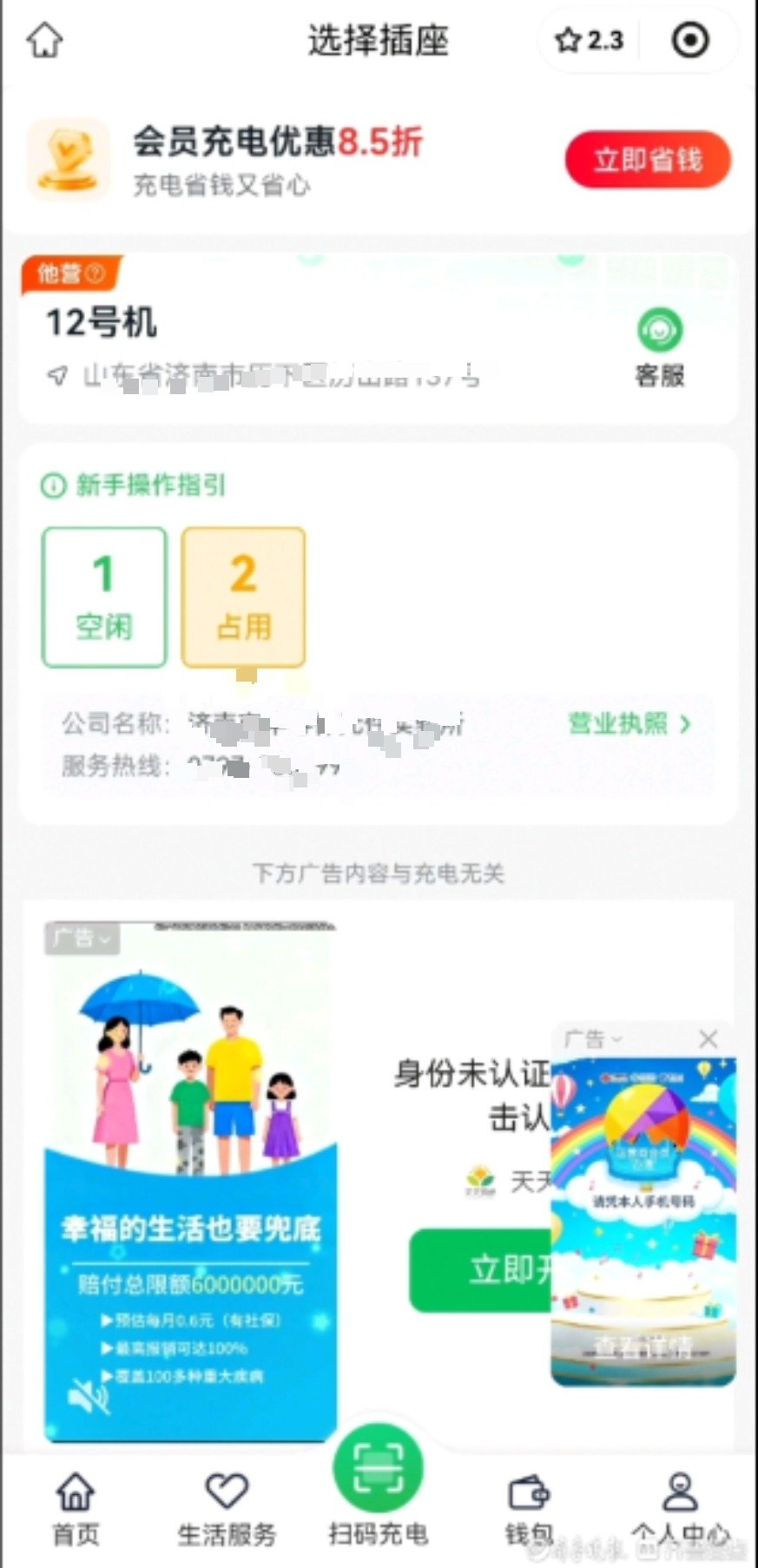 点击跳过后,该弹窗并未消失,而是缩小为右下角嵌套的小型弹窗,进入小程序,页面首先弹出“用户隐私保护提示”弹窗,点击“同意并继续”后小广告才消失。在选择充电位置时,页面中部又出现占屏近一半的该保险广告,内容为“核验未通过,身份保障还未认证成功”,下方则是写有显眼的“立即开通”的绿色条框,在该广告的上方位置有一行灰色小字标注“下方广告内容与充电无关”,如果用户不仔细看,极易忽略掉。