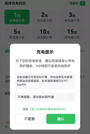 接下来,选定空闲充电桩后,系统弹出“安全提示”弹窗,引导用户加购“安心充电防护(12.8元/365天)”的保险服务;如不需要该服务,选择“暂不需要”进入充电付费环节,点击“去结算”,再次弹出“充电提示”的弹窗,继续引导用户开通防护服务,并提示“9分钱即可享受充电防护”,下方出现两个灰色选择条,第一个提示“充电结束未使用月自动原路返回”,第二个选择条提示“不再提醒,请为我长期开通”,并在末尾有个选择框。如果用户操作太快,只看到“不再提醒”就点击选择,那极有可能因误操作开通长期充电保险服务。