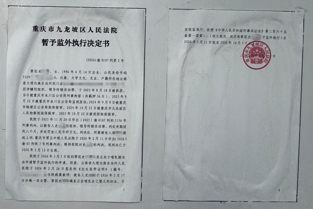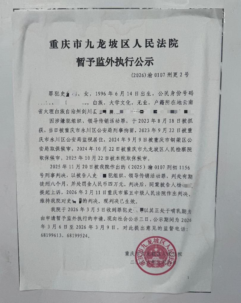 2026年3月5日,九龙坡区人民法院收到罪犯史某某以其正处于哺乳期为由,申请暂予监外执行的申请,向社会公示。3月11日,公示期满,法院再次贴出暂予监外执行决定书:经查,云南省大理州人民医院于2026年2月26日签发的《出生医学证明》及住院病案载明:史某某于2026年2月17日分娩一活女婴,其确系正在哺乳自己婴儿的妇女,不宜收监执行。依照法律规定,决定将罪犯史某某暂予监外执行,时间为2026年3月11日起至2026年10月5日止。