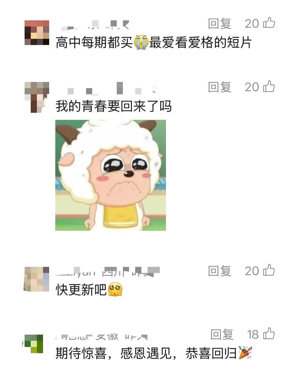 看着大家在后台分享这些年的变化和成长,有人说“当年的孩子长大了,不用辛酸攒钱买一本了”,有人说“我们现在都长大了,不再像小时候买来每个夜晚偷偷看”“好久不见。我也收到了调剂复试通知”“以前是我自己看,现在和孩子一起看”“小时候你们的杂志还抱过我呢”“快点发刊,我现在有工资了”……请相信,这不是青春回头看了一眼,我们不会停留在原地,会一起成长,跟上大家的步伐。