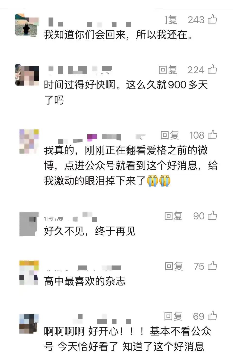 4月8日,爱格杂志微信公众号发文:“我们回来了。距离我们说再见,已经过去912天。外面的世界向前,而我们,将如期归来,好久不见。”不少网友感慨:我的青春又回来了!
