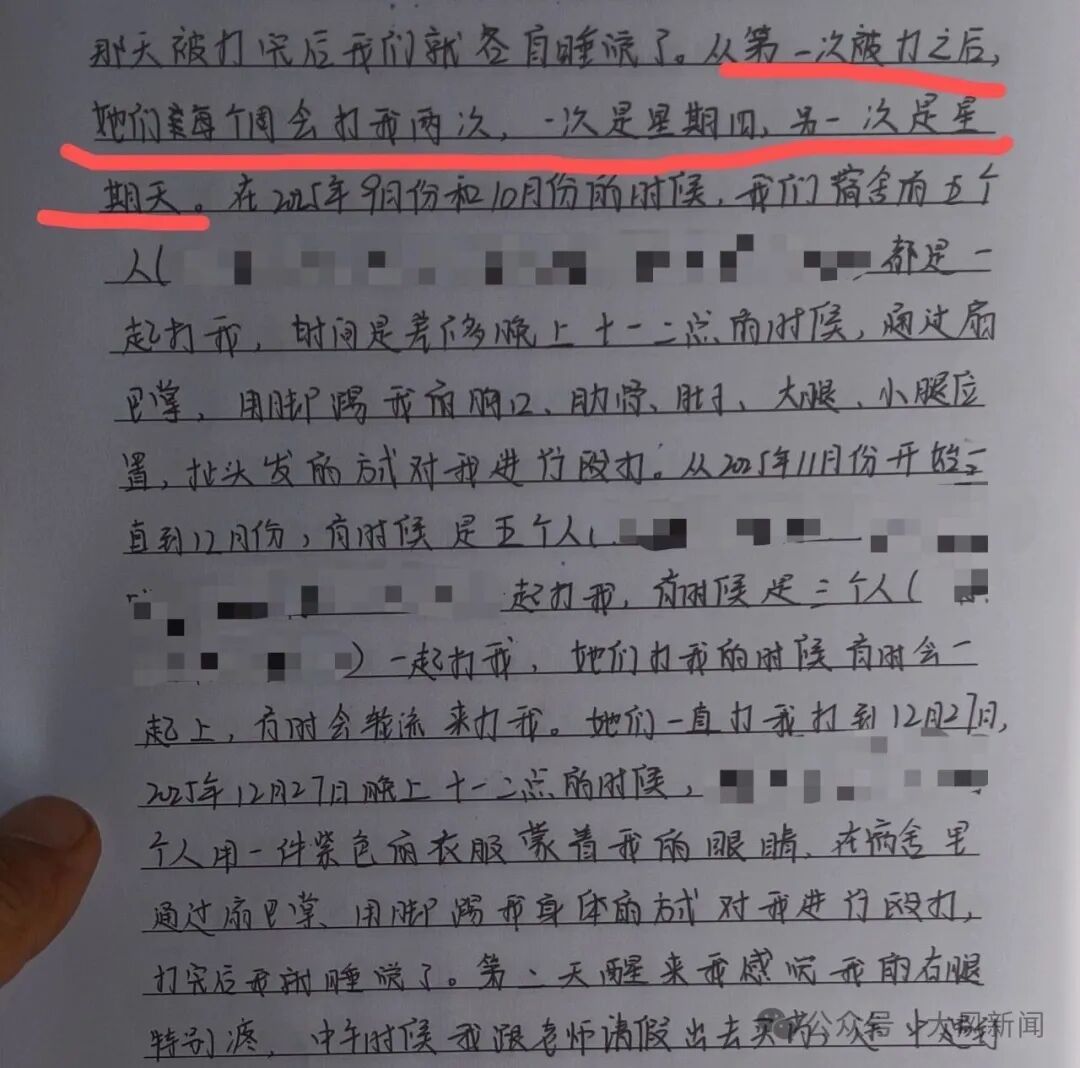 2025年12月31日,张欣笔录中称自己第一次被打是在2025年9月下旬。当时,她在宿舍睡觉,5名舍友将她叫起来,对她掌掴,踢踹肚子、胸口、小腿,扯头发等。