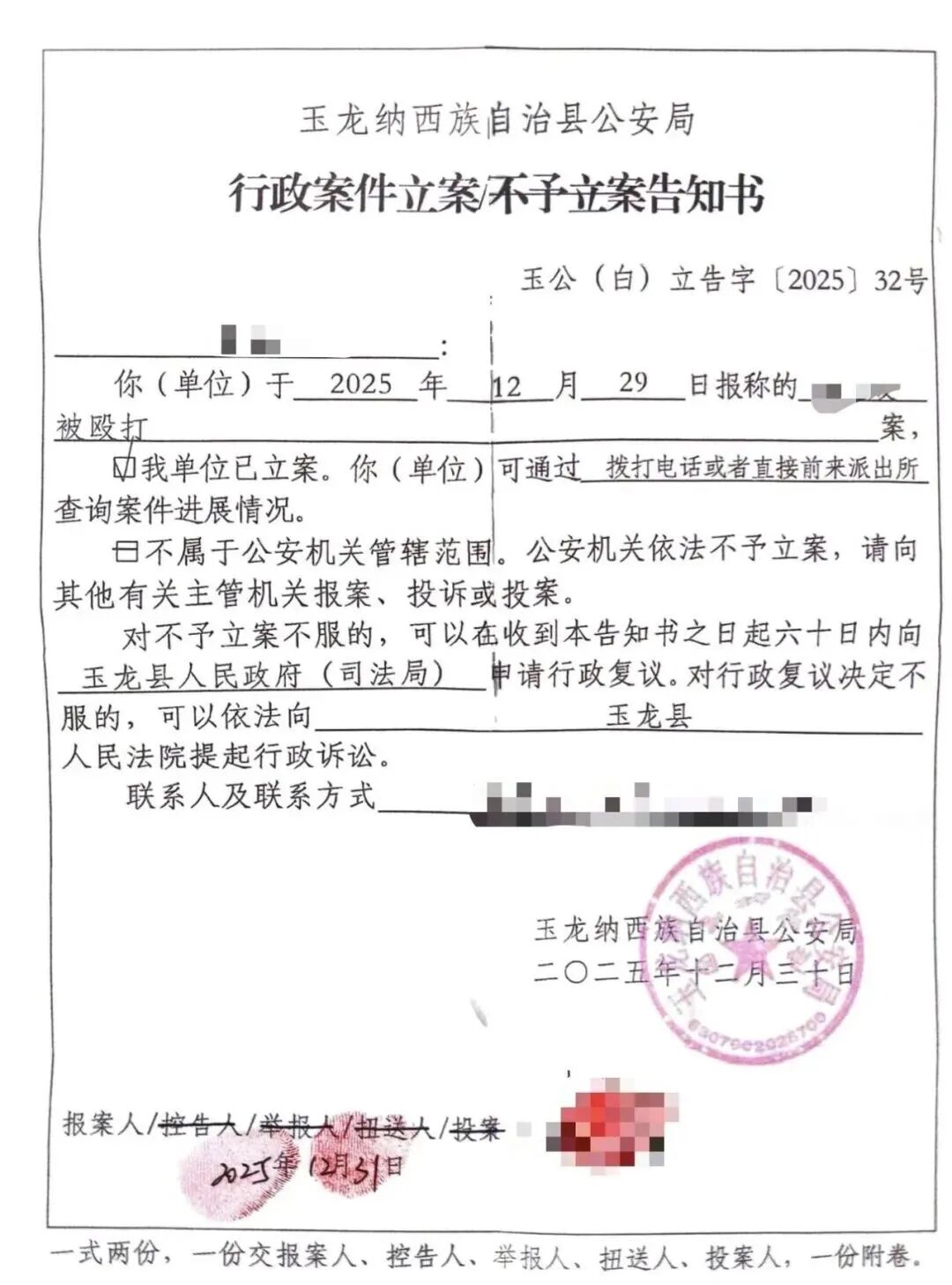 玉龙县公安局出具《行政案件立案告知书》显示:已立案。
