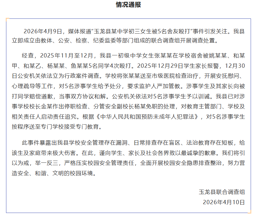 2026年4月9日,媒体报道“玉龙县某中学初三女生被5名舍友殴打”事件引发关注。我县立即成立由教体、公安、检察、纪委监委等部门组成的联合调查组开展调查处置。