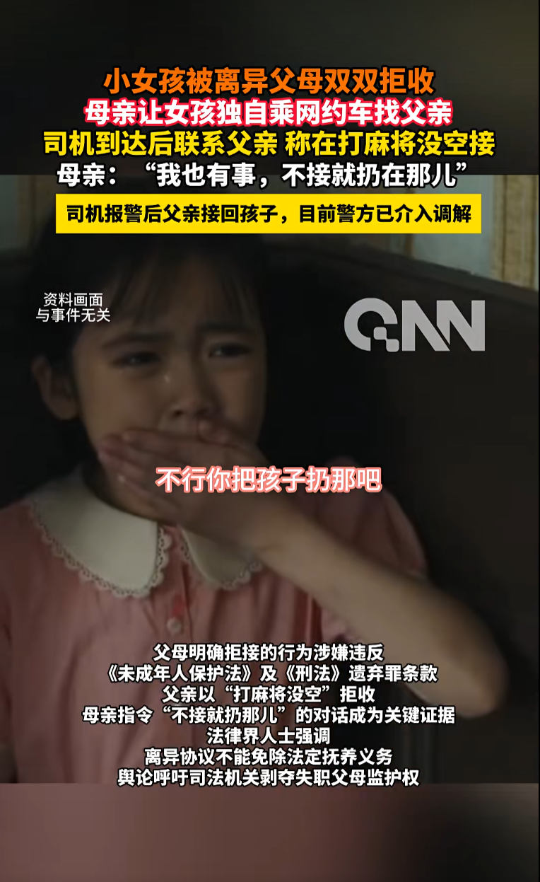 4月10日,#小女孩被离异父母双双拒收后续#登上热搜引热议,据上游新闻,辽宁沈阳一小女孩的母亲让女孩独自乘网约车找父亲,司机到达目的地后,电话却联系女孩父亲,对方称“打麻将,没时间”,让司机再送回孩子母亲那里……女孩母亲的回应也让司机心疼,“我也有事,不接就扔在那。”