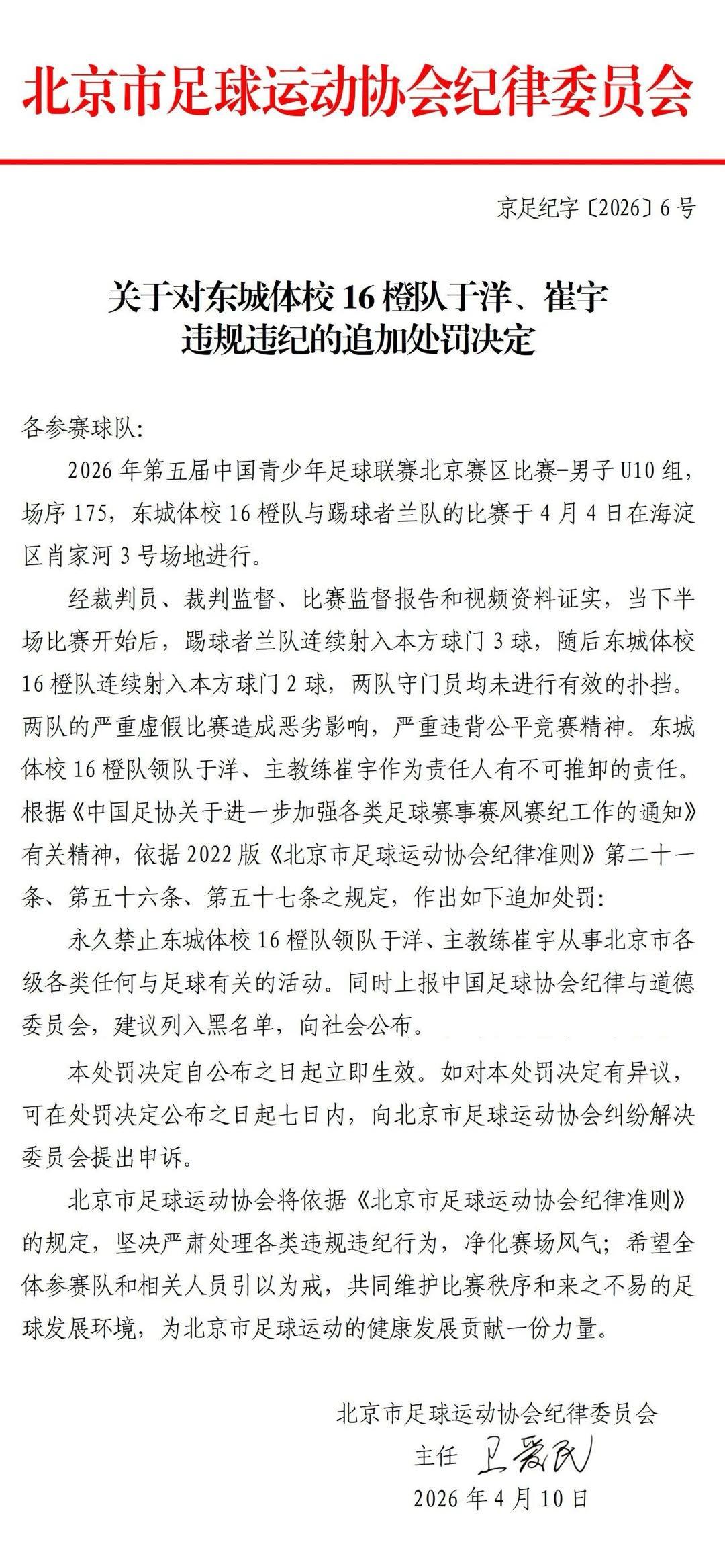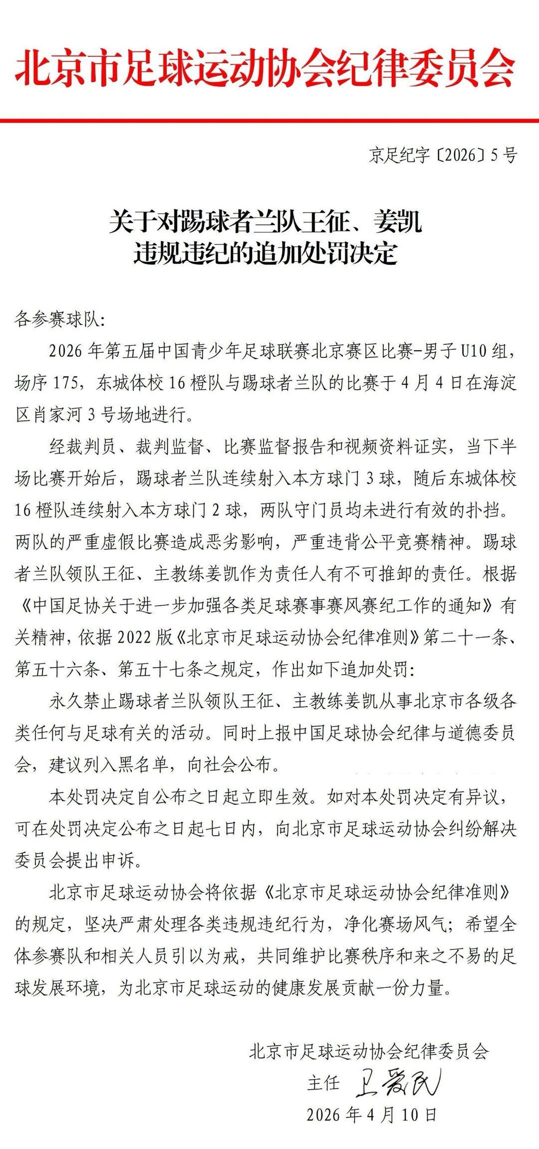 4月10日,北京市足协发布追加处罚公告,对中青赛U10组踢假球的两队主帅及领队进行北京市内永久禁足的处罚。