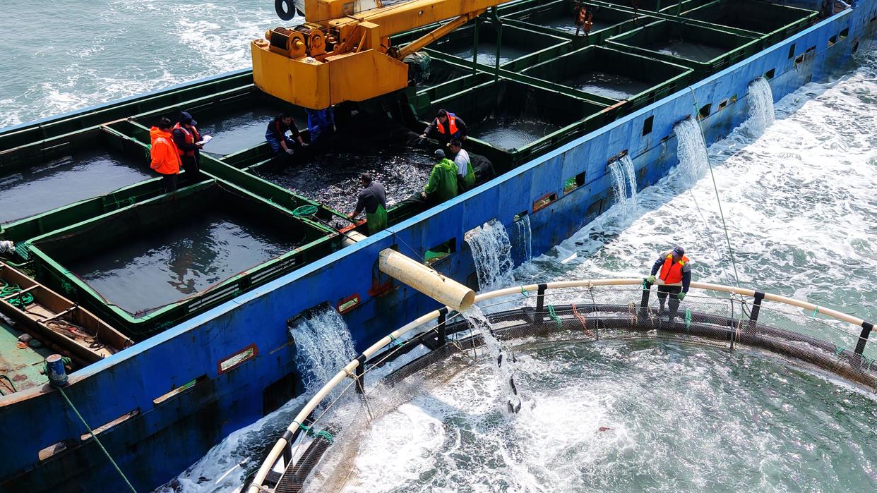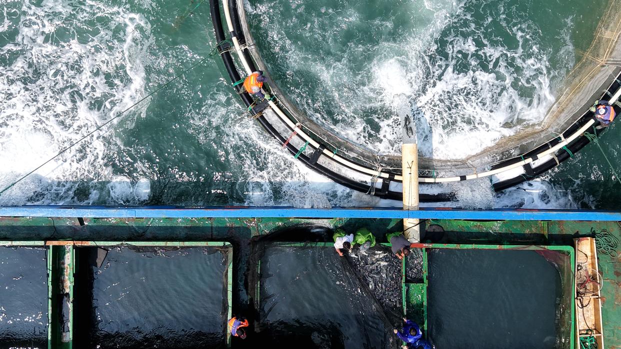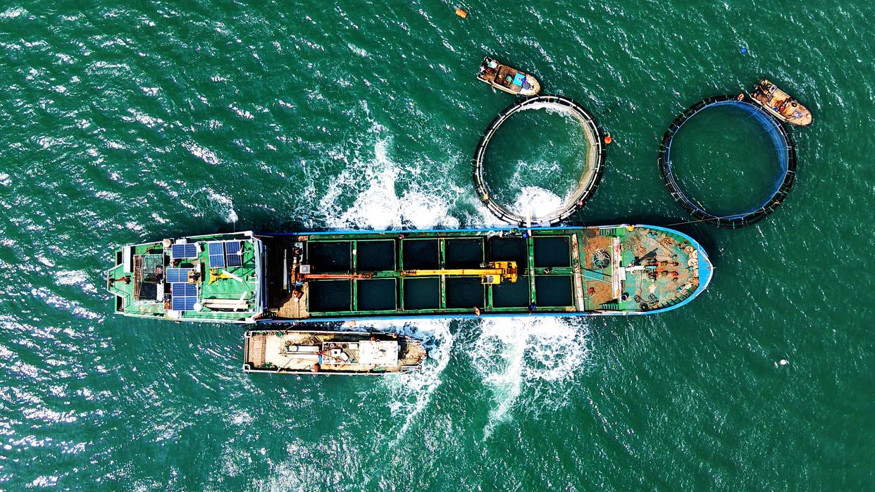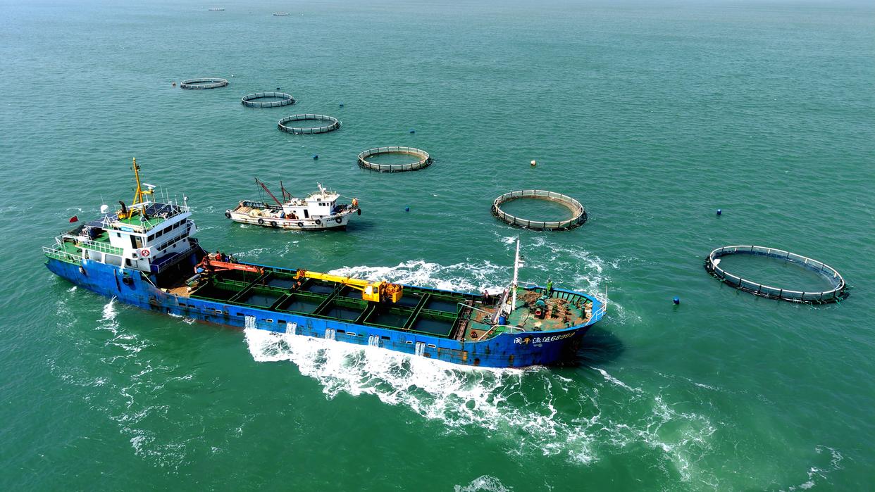 4月10日,山东青岛西海岸新区鲁海丰海洋牧场2026年首批10万尾鱼苗投入深水网箱进行养殖。据悉,青岛鲁海丰海洋牧场地处国家一类水质海域,水温适宜、盐度均衡,比较适宜海鱼生长。