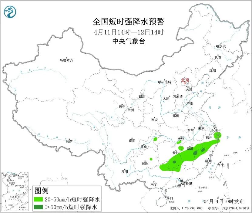 预计4月11日14时至12日14时,江南中东部和南部、华南北部等地的部分地区将有8级以上雷暴大风或冰雹天气,其中,江西中部局地将有10级以上雷暴大风,最大风力可达11级以上;江南中东部和南部、华南北部等地的部分地区将有小时雨量大于20毫米的短时强降水天气,其中,湖南南部、江西东北部、福建西北部等地的部分地区小时雨量大于50毫米。