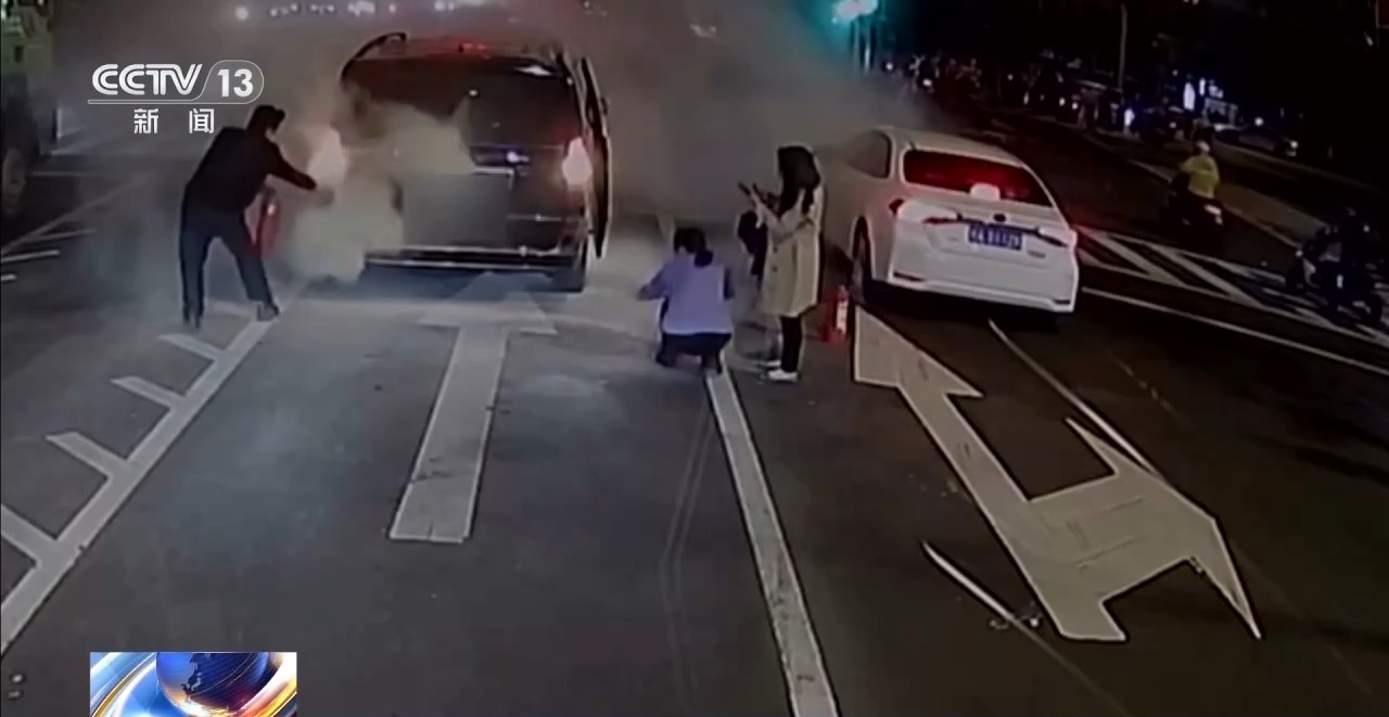 22路公交车司机 郑明焰:我说把车熄火,我去车上给你拿灭火器,当时她可能吓傻了,她小孩还在车上,后面我就说赶紧把小孩弄下来。然后叫(公交)车上的乘客下车,去帮我把周围的车分流,有人帮她照顾小孩,她小孩还在哭, 我是在第一个灭火器用完的情况下,又用第二个灭火器(继续灭火)。