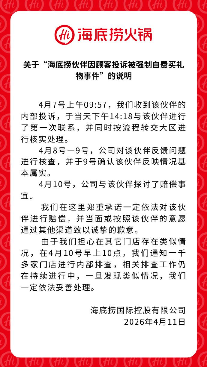 4月11日,@海底捞火锅发布关于“海底捞伙伴因顾客投诉被强制自费买礼物事件”的说明: