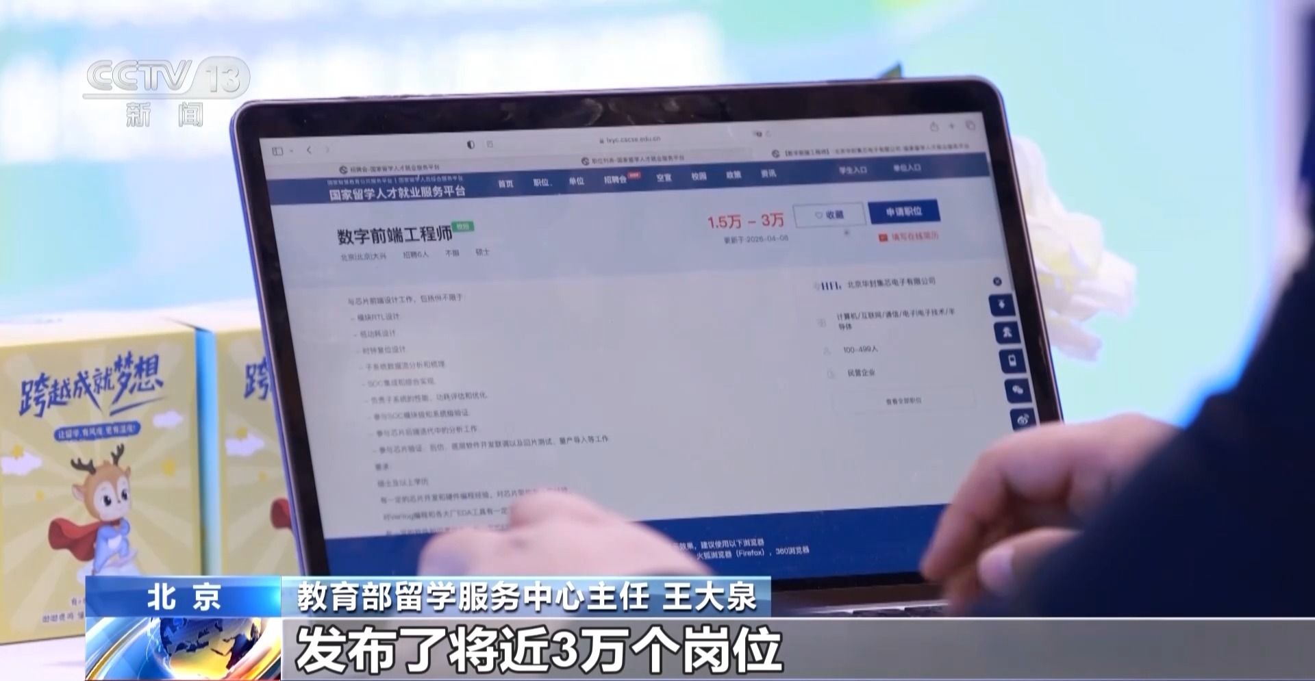 教育部留学服务中心主任 王大泉:国家留学人才就业服务平台上,目前已经注册了43万海外学生。这个线上招聘会上有将近2000家企事业单位,发布了将近3万个岗位,向海外招聘英才,让学生和企业更好在平台上实现供需对接。