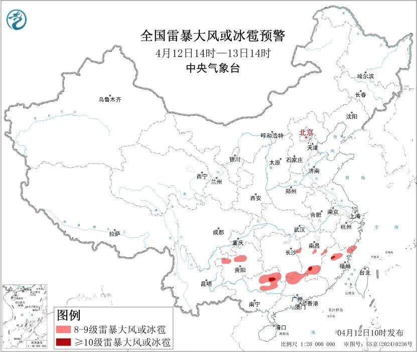 中央气象台4月12日10时继续发布强对流天气蓝色预警:预计4月12日14时至13日14时,江南中南部和东部、华南北部、西南地区东部等地的部分地区将有8级以上雷暴大风或冰雹天气,其中,江西南部、福建中北部、广西北部等地部分地区将有10级以上雷暴大风,最大风力可达11级以上;江南中南部和东部、华南北部、西南地区东部等地的部分地区将有小时雨量大于20毫米的短时强降水,其中,江西中南部、广西东北部等地的部分地区小时雨量大于50毫米。
