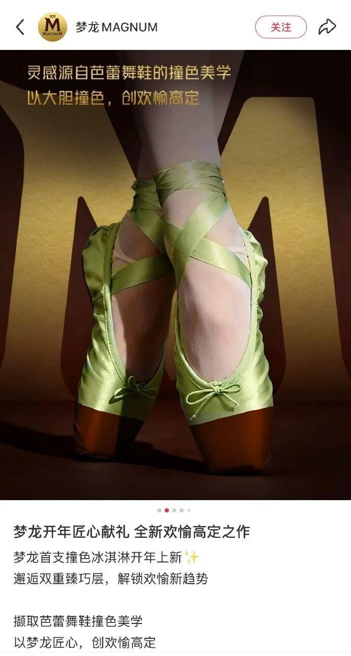 社交平台上的广告截图显示,这则广告主要是为宣传梦龙今年上新的首支撞色冰淇淋。该冰淇淋有浓郁开心果和黑巧克力薄荷两种口味。其中开心果冰淇淋采用巧克力和绿色搭配,薄荷味则是巧克力和蓝色搭配。在冰淇淋的广告语中写有“邂逅双重臻巧层,解锁欢愉新趋势,撷取芭蕾舞鞋撞色美学”的字样。